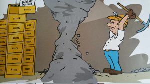 De lay-outwand op de redactie van Geld & Recht: artikel over de pensioenoorlog, okt. 2013